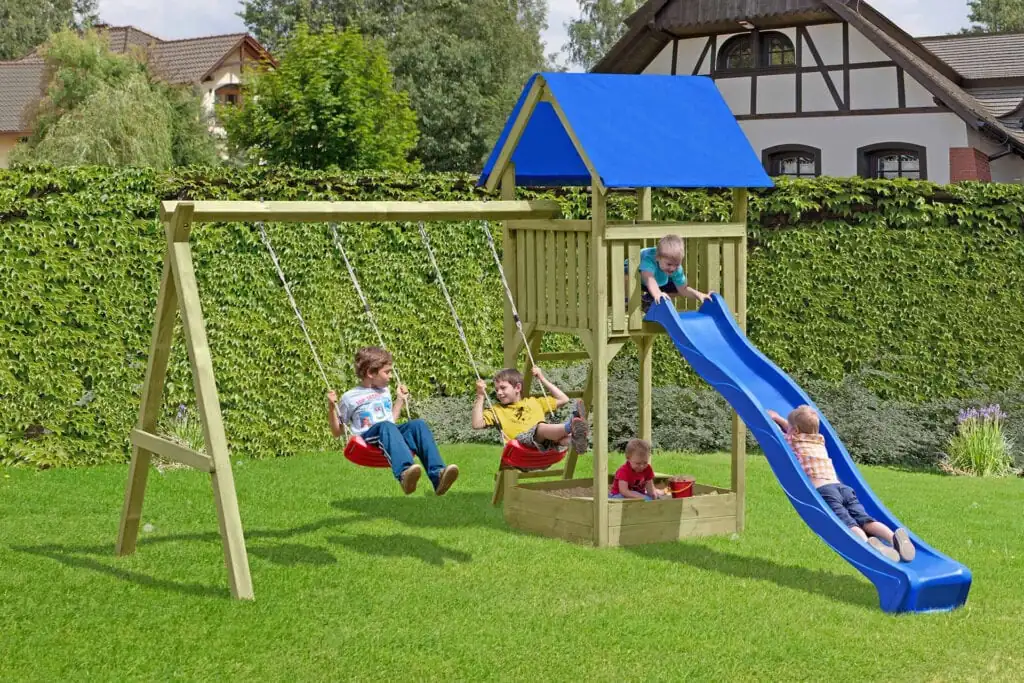 Die Spielanlage Junior überzeugt durch das Komplettpaket- hier schlägt das Kinderherz höher! Der Umfang der Spielanlage Junior besteht aus einem Spielturm, einer Doppelschaukel, einem Sandkasten und 2 Sitzecken. Sie haben sogar die Möglichkeit den Spielturm Junior durch eine Wellenrutsche ergänzt werden und somit decken Sie jegliche Kinderwünsche zum Schaukeln, Rutschen, Buddeln und Entspannen ab.