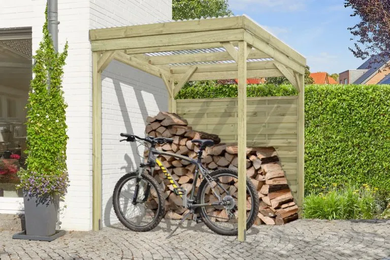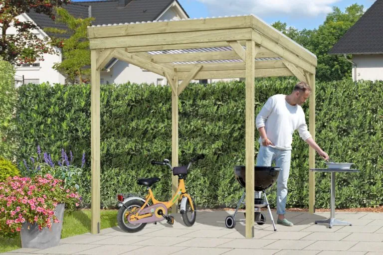 Mit viel Licht von oben schützt der UNIPORT nützliche Dinge. Kaminholz, Fahrräder, Quad, Gartenmöbel oder Spielzeuge finden darunter ihren Platz. Genauso bietet der UNIPORT eine Überdachung für Gäste einer Gartenparty und schützt durch Einbau von Zaunelementen vor Zugwind, Nässe und fremden Blicken. Durch einen Rasterabstand von 181 cm ist die Montage von Zäunen denkbar einfach.